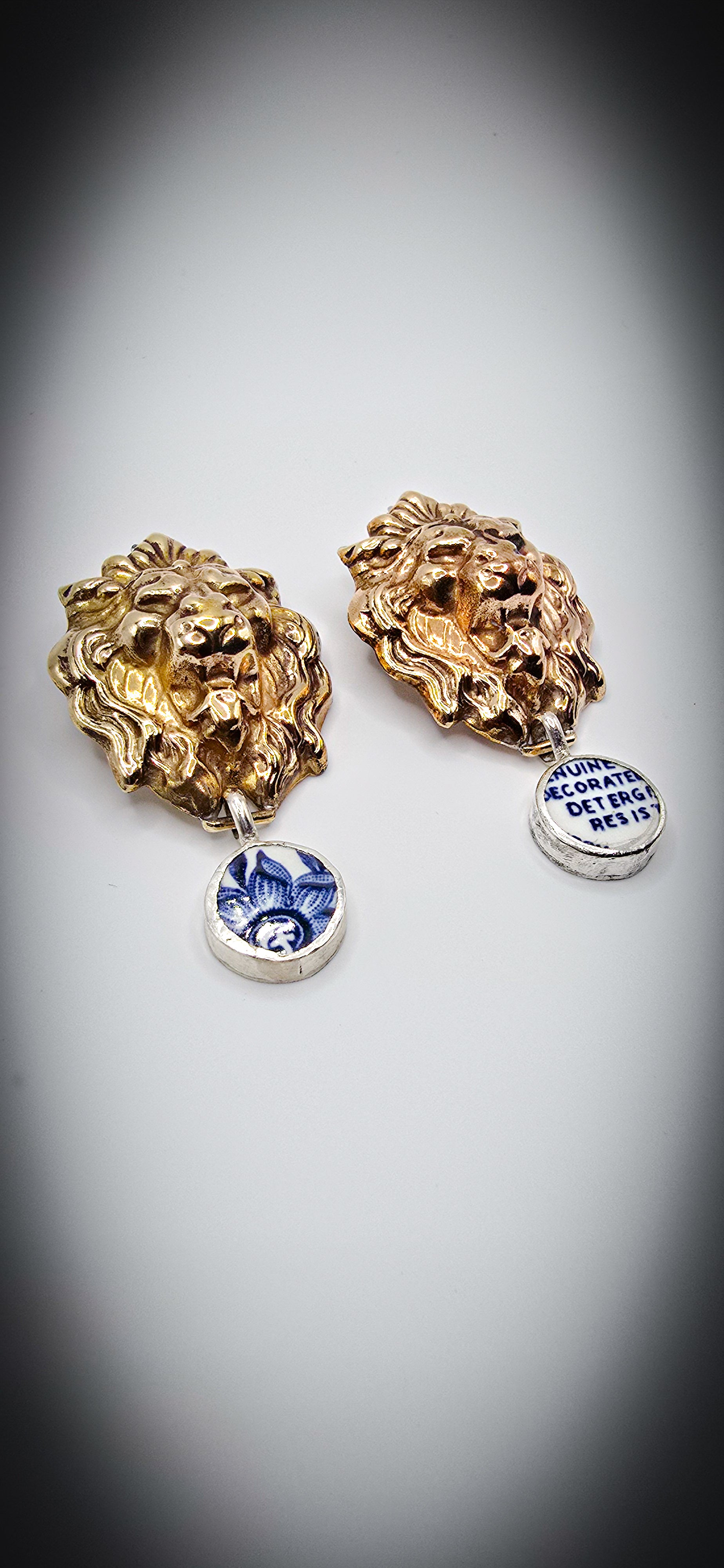 Brass & sterling earrings with Wedgewood china bezel dangles