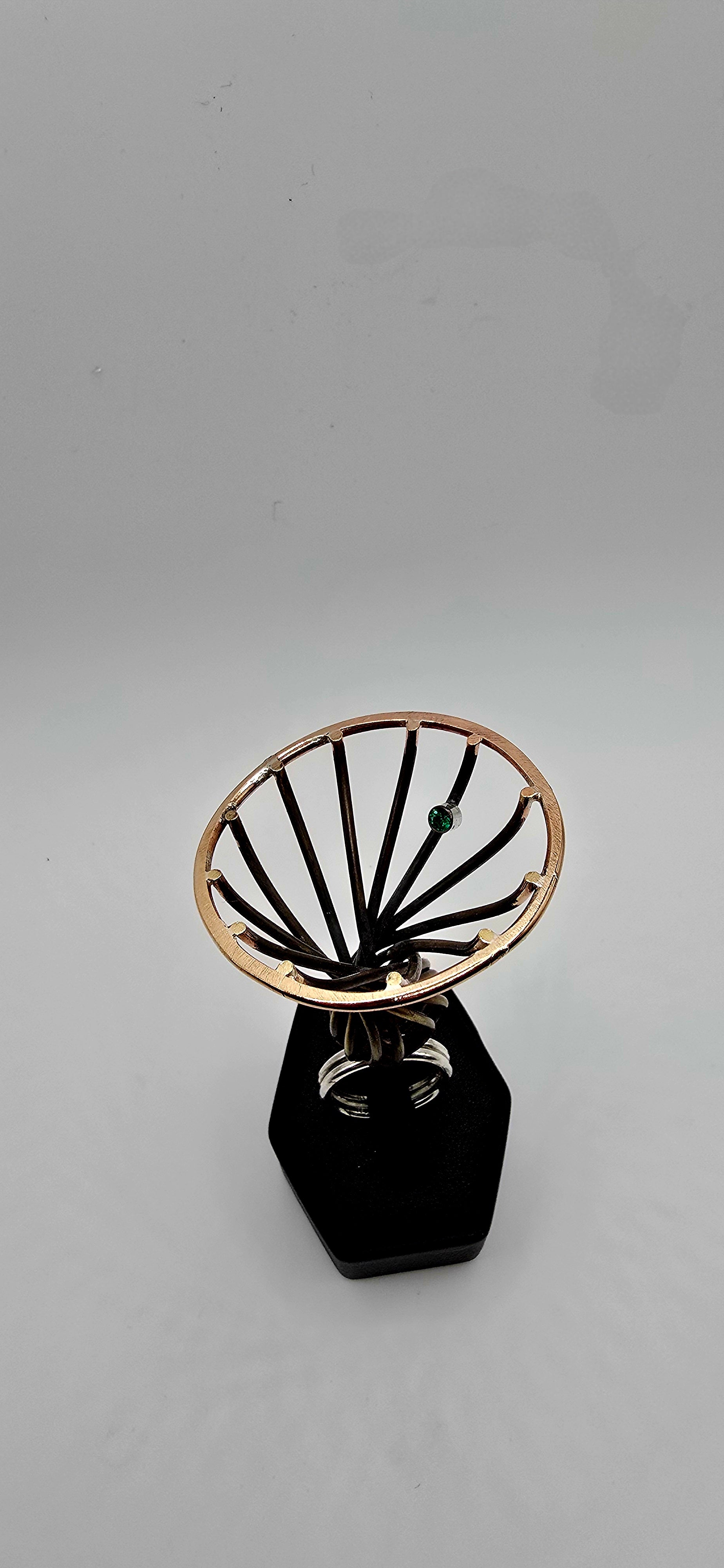 Highly sculptural Vortex Ring in sterling silver and brass featuring a cz emerald gemstone. Size 5.5