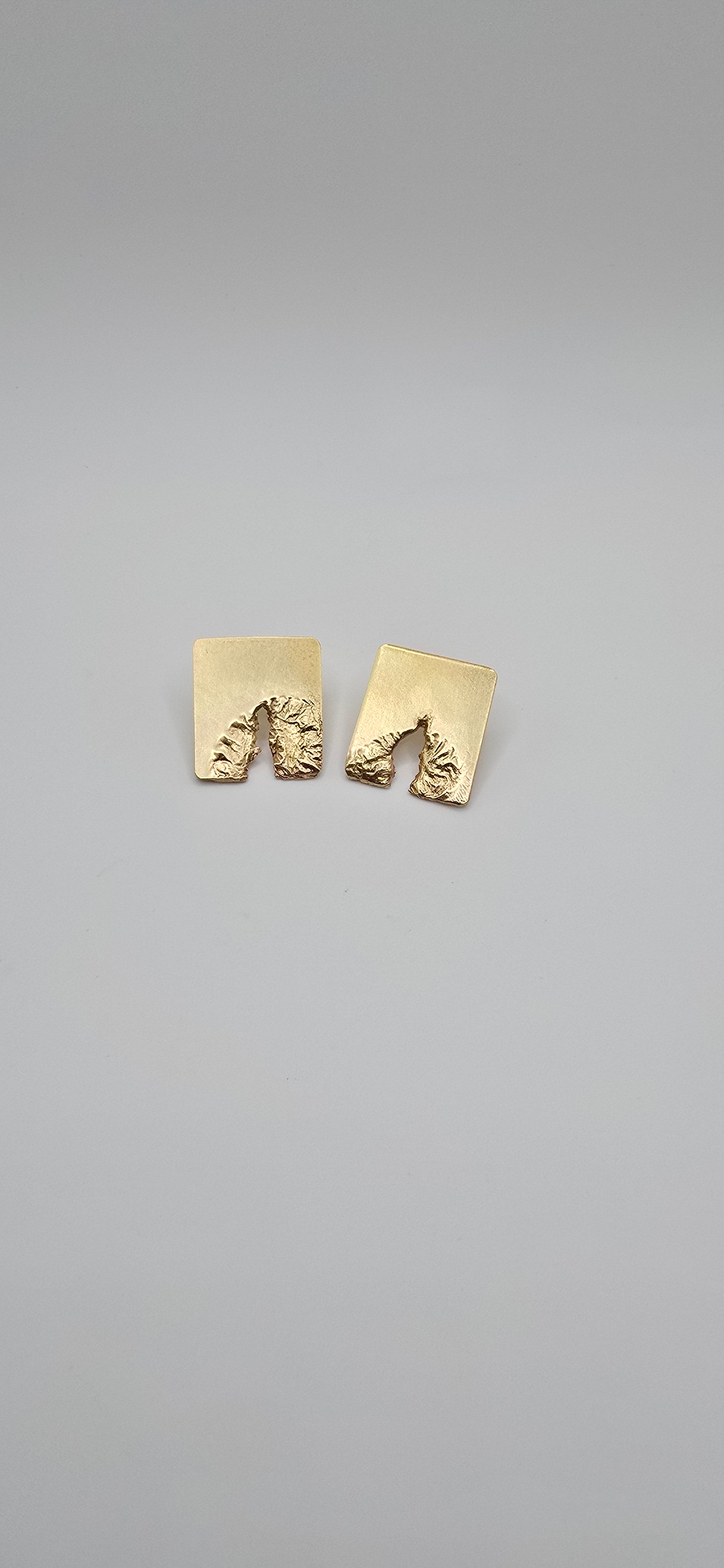 Rectangular brass earrings bear the memory of force, a fracture at the lower edge, molten metal bridging the break. The tear is visible, yet the form endures.